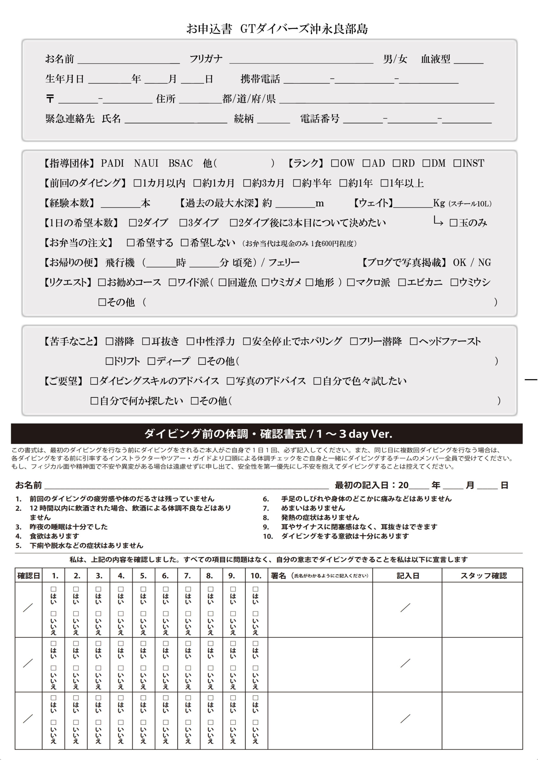 【 ファンダイビング申込書 】A4縦3~4ページ(モノクロ)